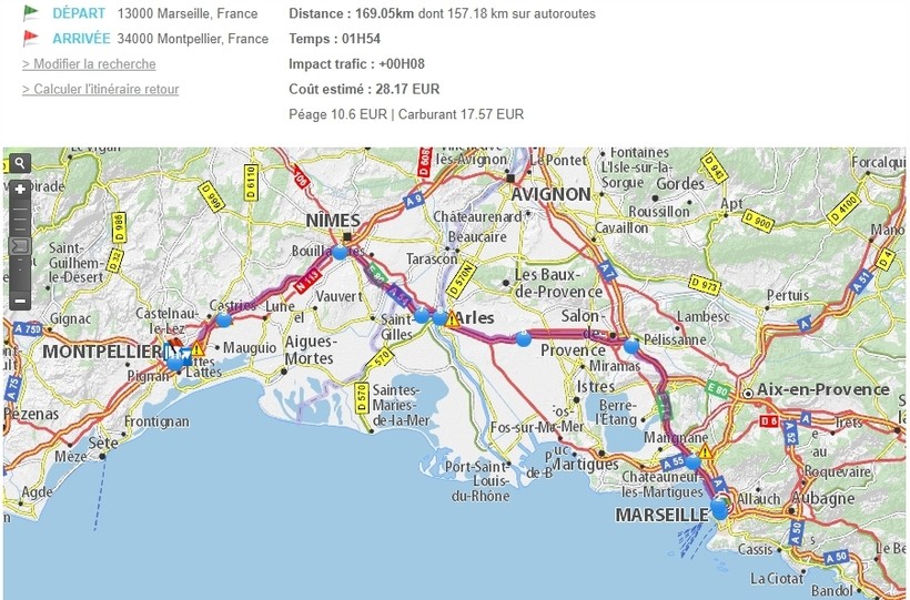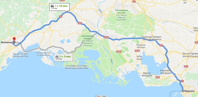 Расстояние между Марселем и Монпелье составляет 78 километров или 48 миль по прямой и 170 километров или 106 миль по автодорогам.