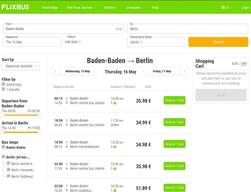 Поездка на автобусе — это самый неудобный вариант поездки. Компания Flixbus выполняет рейсы в Берлин четыре раза в неделю (четверг, пятница, суббота и воскресенье).