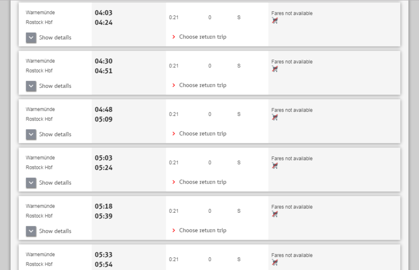 Они отправляются от железнодорожного вокзала Варнемюнде. Ехать недолго — всего 21 минуту.