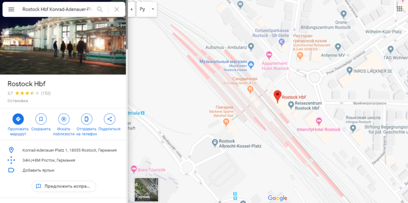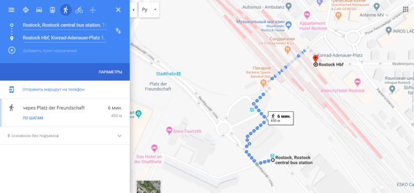 Центральный автовокзал в Ростоке находится в 450 метрах от ж/д вокзала Rostock Hauptbahnhof, на который вы приедете на электричке из Варнемюнде. Как пройти до автостанции видно на скрине.