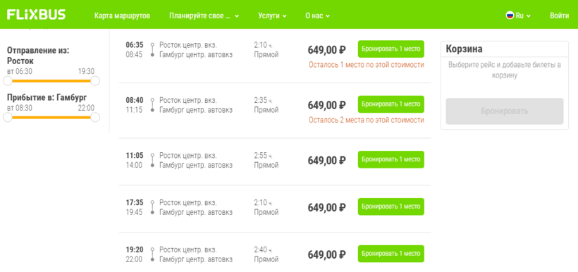 В этом разделе я расскажу, как добраться в Гамбург из города Росток. О электричке Варнемюнде — Росток я писала выше. Время отправления автобусов фирмы Flixbus, следующих в Гамбург, такое: 06:35, 08:40, 11:05, 15:15, 17:35 и 19:20. Только по вторникам нет рейса в 15:15, а по средам еще и рейс в 08:40 отсутствует. Лучше смотрите расписание на свои даты самостоятельно на сайте перевозчика.