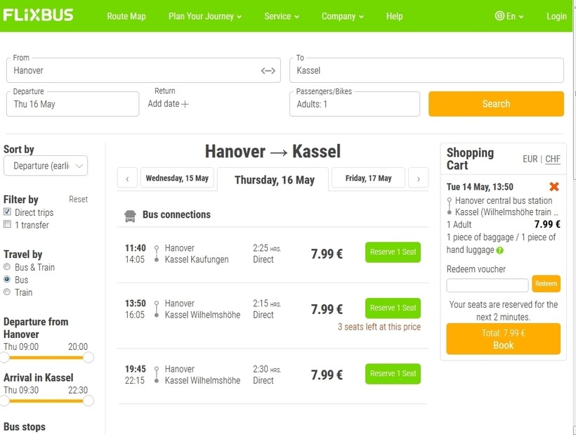 Из Ганновера в Кассель ежедневно ходят автобусы фирмы Flixbus. Если вы опытный путешественник, то эту фирму знаете, ее автобусы ездят практически по всем европейским маршрутам.