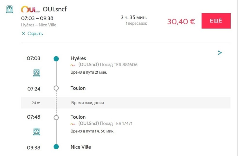 Это удобный и вполне комфортный способ добраться в Ниццу, я его вам настоятельно рекомендую. Поездов по этому маршруту ходит немало, на скриншоте один из вариантов.