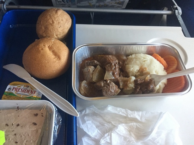 К слову сказать, бортпроводники разносили еду во время полета. Перекусить этим вполне реально, поскольку в перекус входили горячее блюдо (в виде курицы с рисом или макарономи), печенье и напитки.