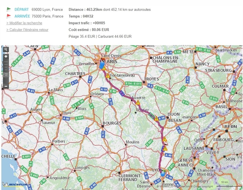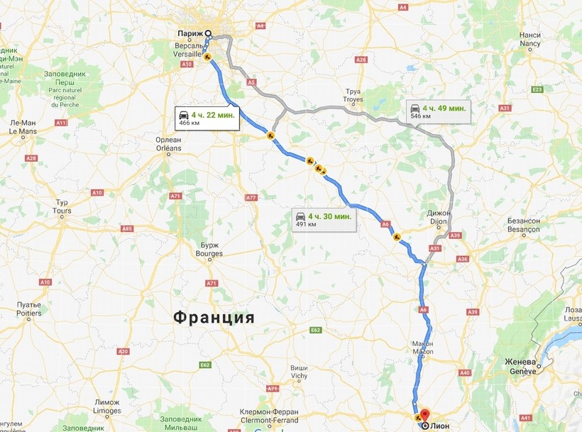 Расстояние между Лионом и Парижем составляет 244 километра или 152 мили по прямой и 463 километра или 287 миль по автодорогам.