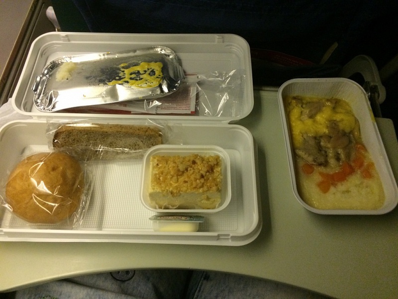 После старта разнесли прохладительные напитки, а вот обед ждал меня только через полтора часа. Как раз я успела хорошо проголодаться. :) Кормили нас два раза. Как правило, питание включало: