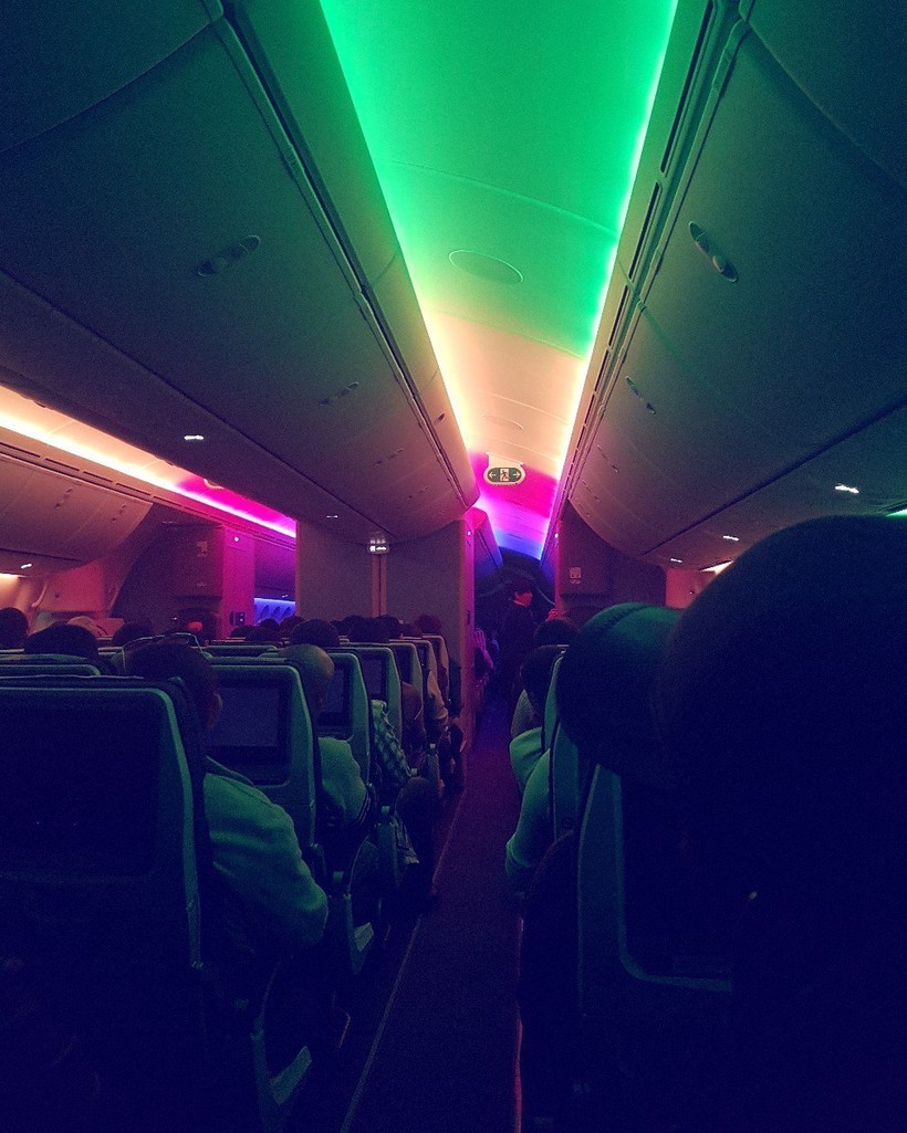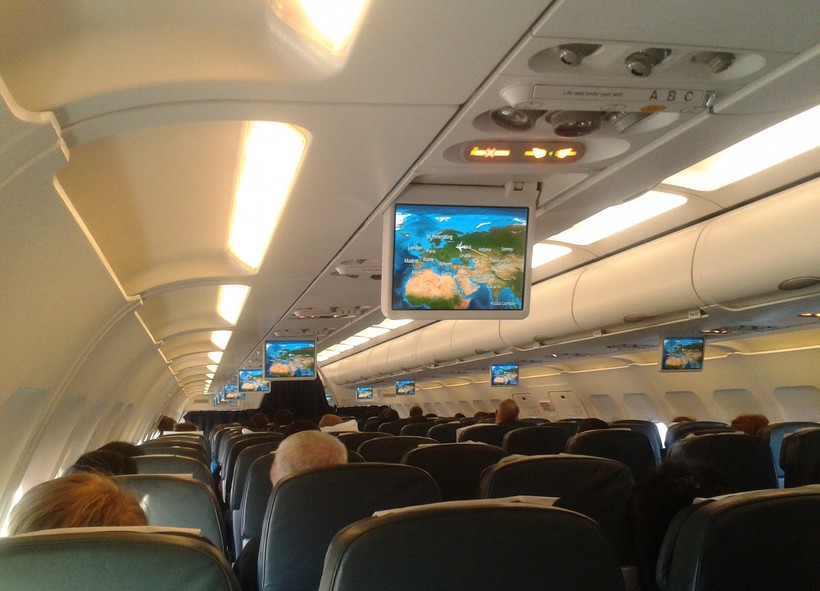 Хороший борт самолёта Boeing 767, чистота в салоне самолёта. Несмотря на то, что билет бы в экономический класс, кресла имели приличное расстояние до стоящих спереди. В каждом установлены экраны, на выбор из предлагаемых развлечений: