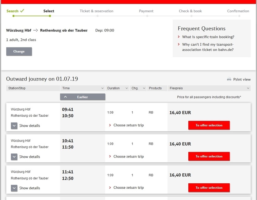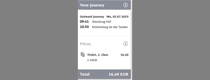 Если вы покупаете разовый билет, то вам нужно обязательно успеть сделать пересадку на станции Steinach. Или придется покупать билет от станции Steinach в Ротенбург еще раз. Поэтому, если покупаете билет через сайт железнодорожного оператора, укажите пересадку в 1 час.