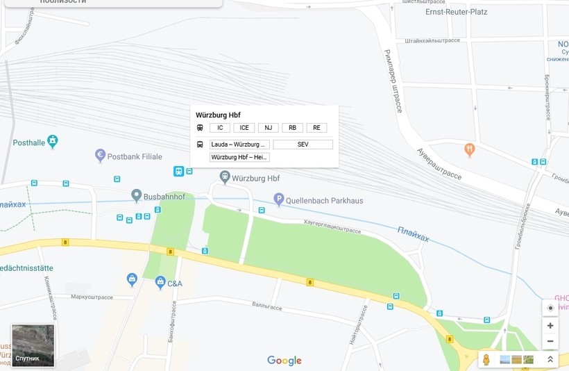 Вокзал отправления поездов — Würzburg Hauptbahnhof на Bahnhofplatz 4.