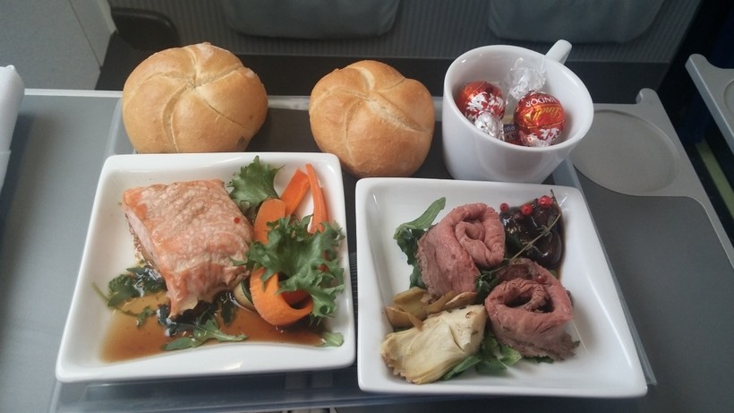 Кормили каждые 3 часа. В самом начале полета мне выдали книжечку с меню, где я выбрала блюда, которые пробовала на протяжении полета. На обед мне принесли кусочек лосося с овощами, телятину, свежую булочку и небольшой десерт. Напитки предлагали во время всего полета.