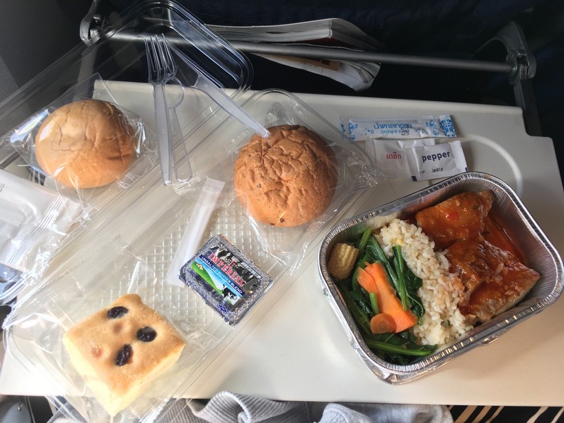 Дождавшись долгожданной посадки, мы были приятно удивлены комфортом, и обслуживанием в самолете «Airbus A330-300». Между сидениями были прекрасные просветы, ноги не упирались в спинки. У каждого пассажира была не только своя развлекательная система с широким выбором свежих фильмов на всех языках, но еще и набор из гигиенических средств, куда входила зубная щетка, паста, ночная маска для глаз, и прочие мелочи. Сразу после взлета стюардессы выдали теплые полотенца для вытирания рук, после чего приступили к раздаче еды. Меню оказалось более чем пристойным: рис с курицей в соусе, бобы в томате, свежий салат, бутылочка вина, шоколадный мусс и булочка с маслом.