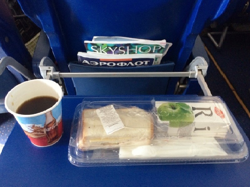 Несмотря на то, что лететь совсем немного, компания «Аэрофлот» предлагает своим клиентам в эконом классе холодное питание. Мне принесли булочку с сыром и кусочками мяса и яблочный сок. Также я выпил чашку горячего кофе.