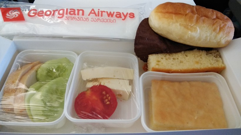 Горячих блюд нам предложено не было, хотя ранее я уже летала в Грузию на Georgian Airways и в тот раз кормили полноценной горячей едой. В этот раздали свежие овощи, грузинский сыр, хлеб, выпечку, разнообразные напитки, в том числе грузинское красное вино, но учитывая короткий перелёт этого вполне хватило.