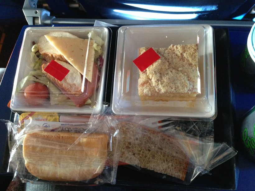 Через минут 20 после того, как самолет набрал высоту, стюардессы стали разносить прохладительные напитки, вслед за которыми последовал обед. Обеденный набор включал в себя: