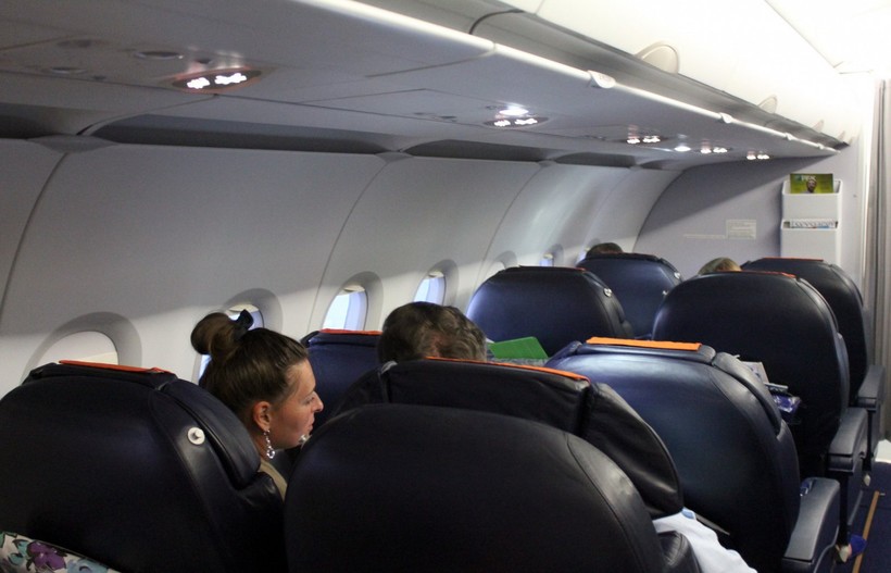 На борту самолета нас встречали приветливые стюардессы. Салон аэроплана приятный, обивка как новая, сиденья удобные. Через некоторое время после взлета всем детям принесли подарки в фирменных мешочках, которые включали в себя набор карандашей, бумажные игру, и книжку с увлекательными заданиями. Также, всем замерзающим выдали мягкие пледы.