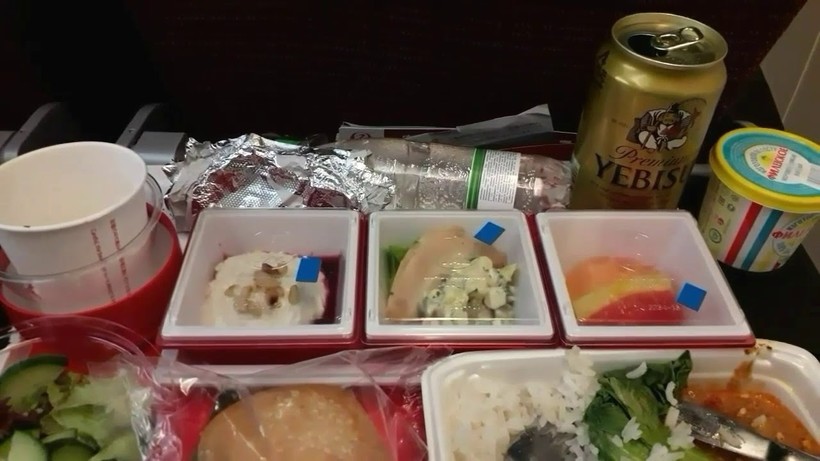 Вылетели по расписанию. За всё время полёта кормили два раза, но зато напитки предлагали ежечасно. Давали в основном японскую еду — салаты, просто овощи, булочки, рис с подливкой и мясом и т.д.