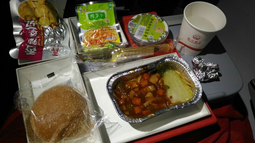 Питание на борту вполне съедобное, но только если вы привыкли к китайской кухне. Еда довольно острая и солёная, но мне было вкусно. Из положительного: напитки в течение всего полёта предлагались в неограниченном количестве, правда, их выбор был очень скудным. Из алкоголя предлагали вино и пиво, но пить это было невозможно, пиво водянистое, а вино очень кислое.