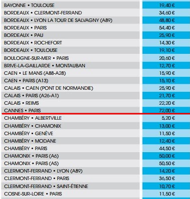 Я поехала через А7 и А6, так было быстрее всего. Теперь немного расскажу о платных дорогах во Франции. Оплата взимается либо при въезде на платный участок (фиксированная цена), либо на выезде из него — за расстояние, которое вы проехали фактически. Для этого нужно в начале пути взять в автомате билет (ни в коем случае не теряйте его), а в конце дороги повторно вставить его в автомат и оплатить ту сумму, которую насчитает система. Я пошла более удобным путем и зарегистрировалась на сайте telepeage. Это дает возможность автоматически оплачивать проезд, не останавливаясь. Для этого на лобовое стекло нужно приклеить идентификатор, система будет автоматически списывать деньги за проезд. Вот расценки.