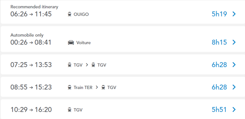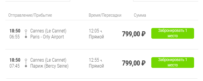 На скрине утренние рейсы, но есть еще в 14:26, 16:20 и 17:26. Все поезда отправляются от станции Cannes-la-Bocca, а прибывают на вокзал Paris-Gare-de-Lyon.