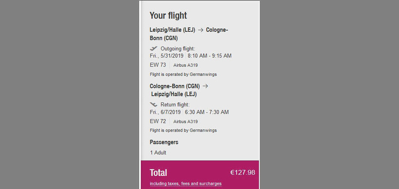 Я летела из Лейпцига в Кёльн прямым рейсом авиакомпании Eurowings. Самолеты Eurowings летают дважды в день — утром и вечером. Еще я видела прямые рейсы по этому направлению у Lufthansa, но билеты у этой авиакомпании стоят дороже.