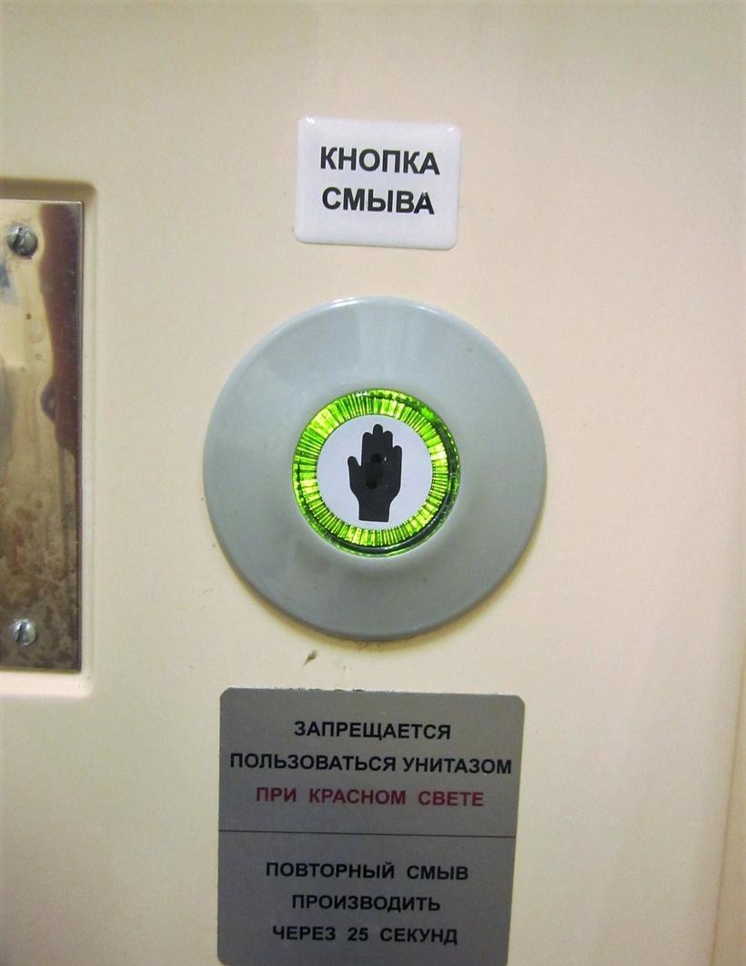 В туалете же все было по высшему разряду (их, кстати, два на вагон). Чистый биоунитаз, и вот такая вот сенсорная кнопка (на нее даже нажимать не надо, просто руку поднести):