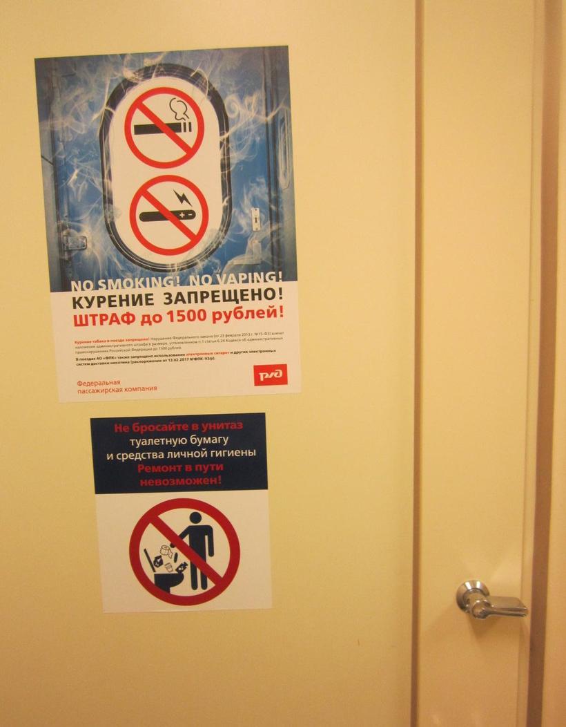 Сам вагон довольно старый, но переделан согласно современным нормам и требованиям. Температура в пути поддерживалась вполне корректная. На входе в туалет висело вот такое предупреждение: