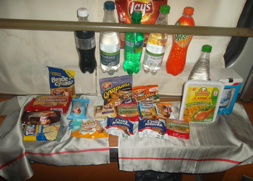 Питания в поезде нет, но можно купить кое-что у проводника. Возле его купе выставлена такая продукция на продажу:
