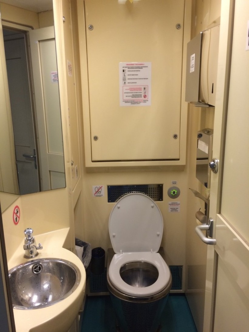 Туалет очень удобный и новый. Туалетная бумага была, жидкое мыло тоже. В уголке стоял освежитель воздуха. Правда, так было не всю поездку, мыло вскоре закончились, и его проводники не доливали.