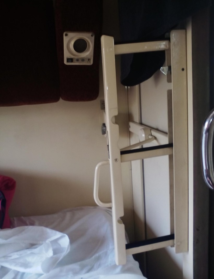 Ехал я в летнее время, но благодаря имевшемуся в вагоне кондиционеру, температура была вполне комфортабельной. При этом не было традиционного «дубаря» на верхних полках из-за потока холодного воздуха из кондиционера. Кстати, на верхние полки можно было попасть с помощью вот такой вот лестницы:
