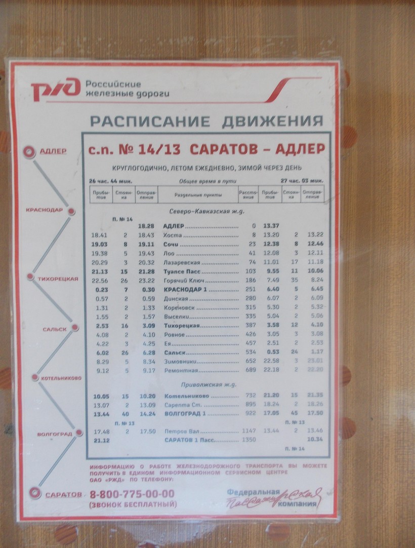 Мой состав № 013Ж отправился в путь в 16:54 со станции Волгоград-1, а прибыл в 11:45 на следующий день на вокзал Сочи. Пришлось одну ночь провести в поезде, но условия были более чем комфортабельными.