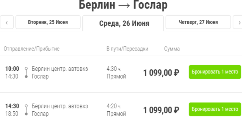 Так, ежедневно от главного автовокзала Берлина на Masurenallee 4-6, в Гослар отправляется всего два рейса — в 10:00 и 14:30.
