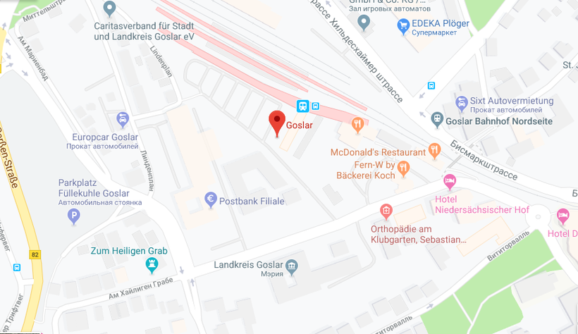 В Гослар поезда прибывают на ж/д вокзал Goslar на Hildesheimer Straße 53.