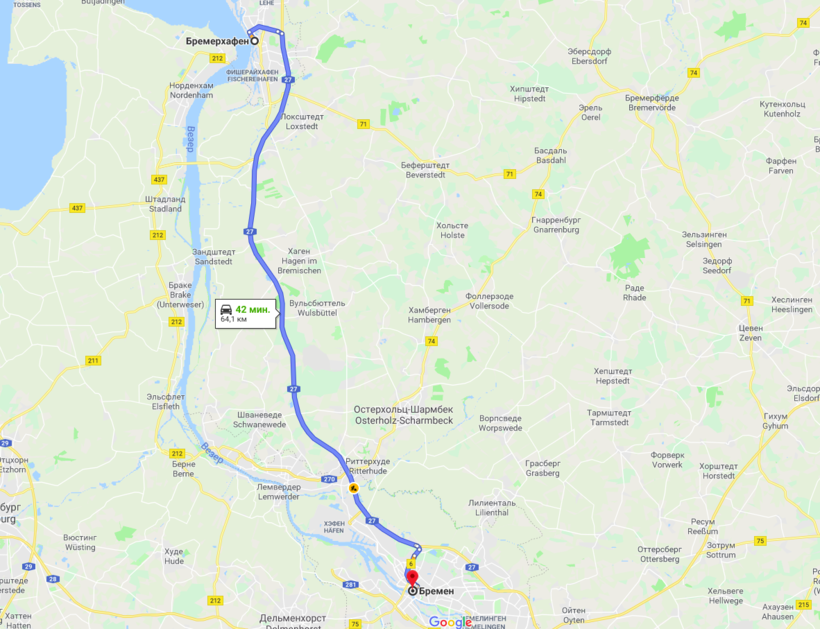 Добраться в Бремен на автомобиле можно примерно за 40 минут. Схема проезда вот такая: