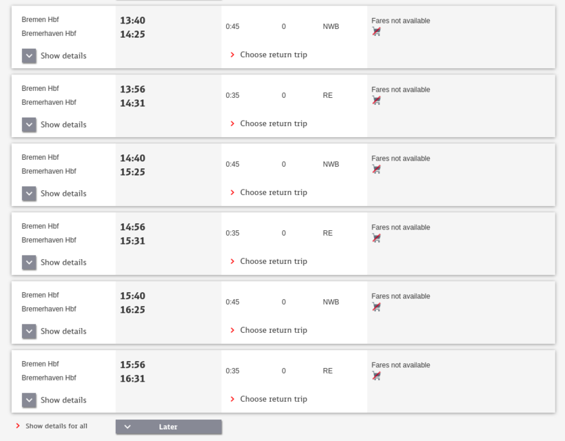 Расписание поездов можно уточнить на сайте немецкого железнодорожного оператора. Вот скриншот с частью расписания: