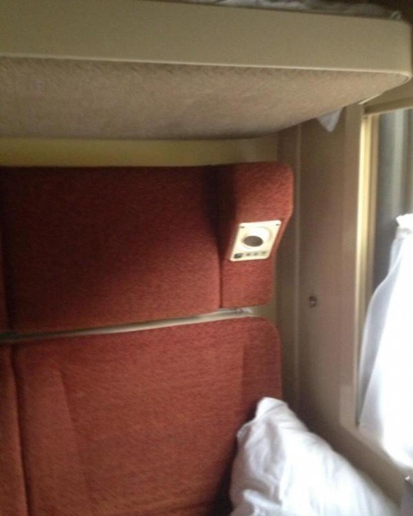 Диванчик при надобности можно сложить и превратить в обычную полку для сна. В моем случае это было очень кстати, я с удовольствием поспал несколько часов. Подушка и матрас упрятаны в спинку дивана, что довольно удобно, не нужно было тратить время на их извлечение с багажной полки (как это было в старых поездах).