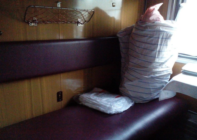 В общем, это был вполне типичный вагон времен СССР и 90-х годов. На полу лежал традиционный ковер, на окне висела занавеска, а также небольшая скатерть лежала и на столике. И занавеску, и скатерть я от греха подальше снял, чтобы не запачкать едой.