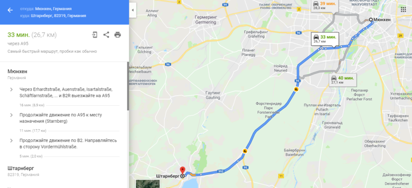 Расстояние между Мюнхеном и Штарнбергом совсем небольшое — 26 км. Такой путь можно проехать на машине всего лишь за 30 минут. Если вы нагуляетесь по городку, можете также заехать в Тутцинг. Он расположен вдоль озера немного дальше и также очень интересен.