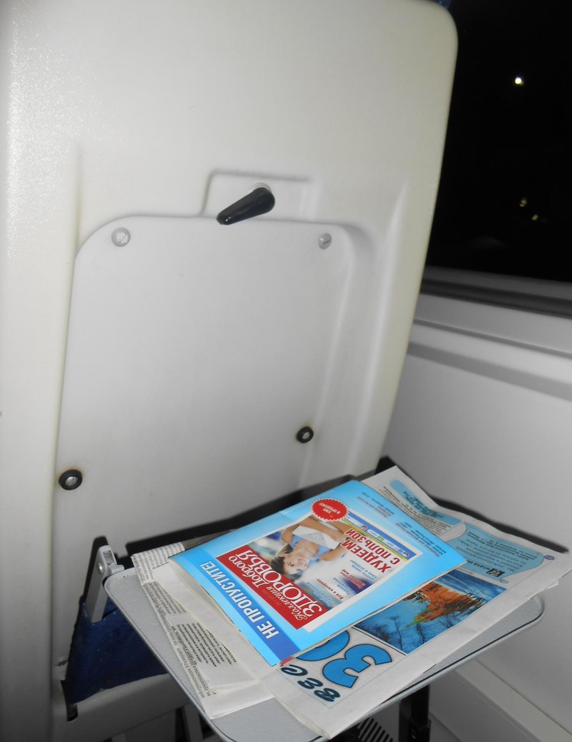 Места, признаться, довольно мало. Вагон разделен на 2 части, одни пассажиры едут по ходу движения, а другие – задом наперед. В спинке впереди стоящего кресла смонтирован откидной столик. Вот как он выглядит в разложенном виде: