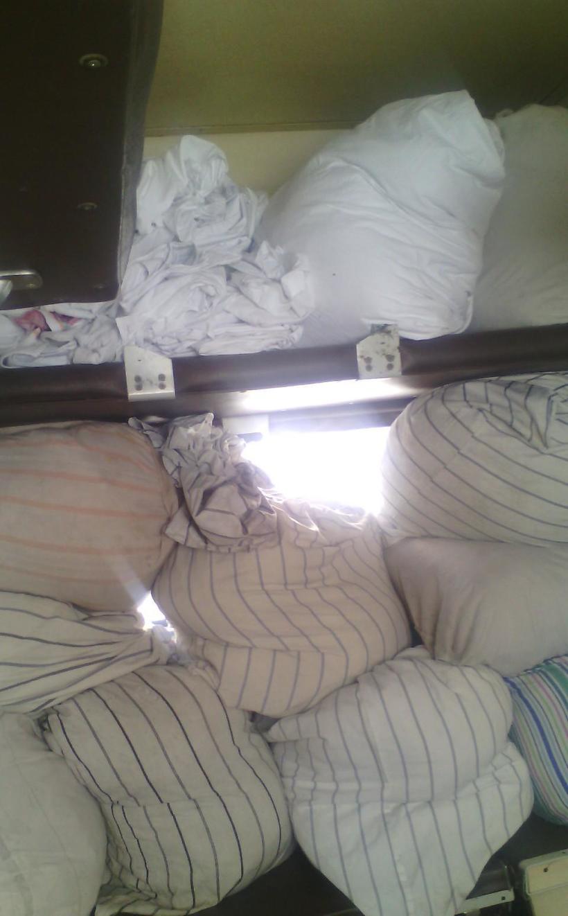 Кроме того, в вагоне было очень жарко и душно, поскольку ни о каком кондиционере речи не шло. Были проблемы и с пожарной безопасностью, вот как хранились все матрасы и подушки: