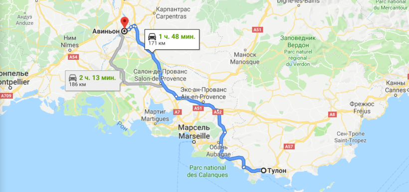 Расстояние между Тулоном и Авиньоном составляет 128 километров или 80 миль по прямой и 161 километр или 100 миль по автодорогам.