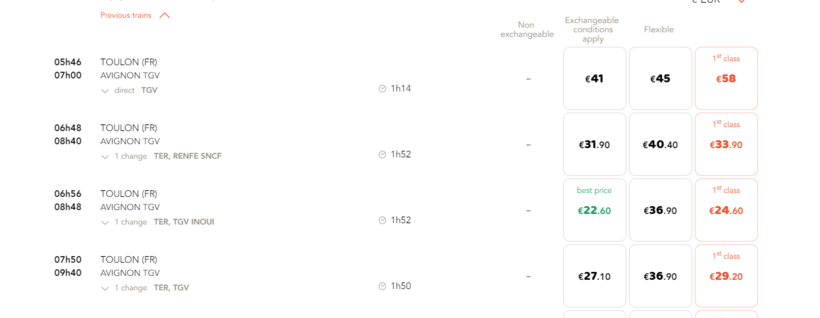 Во Франции настолько развит железнодорожный транспорт, что я даже не удивилась, что есть поезда из Тулона в Авиньон. Правда, думала, что прямых рейсов будет больше, а их только около 5. Большинство рейсов с пересадкой, ее нужно делать в Марселе. Первый поезд отправляется из Тулона в 05:46, а последний — в 19:17. Доехать можно за 1,5–2 часа.