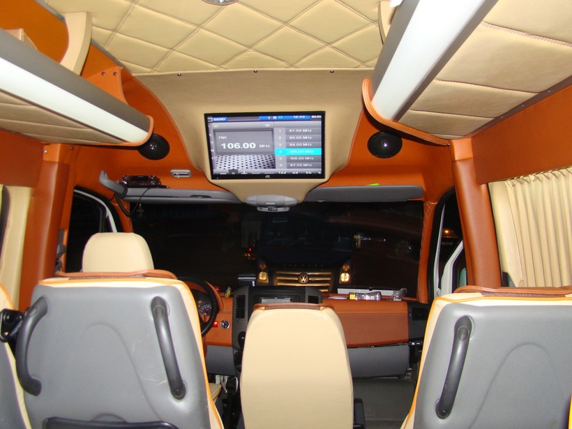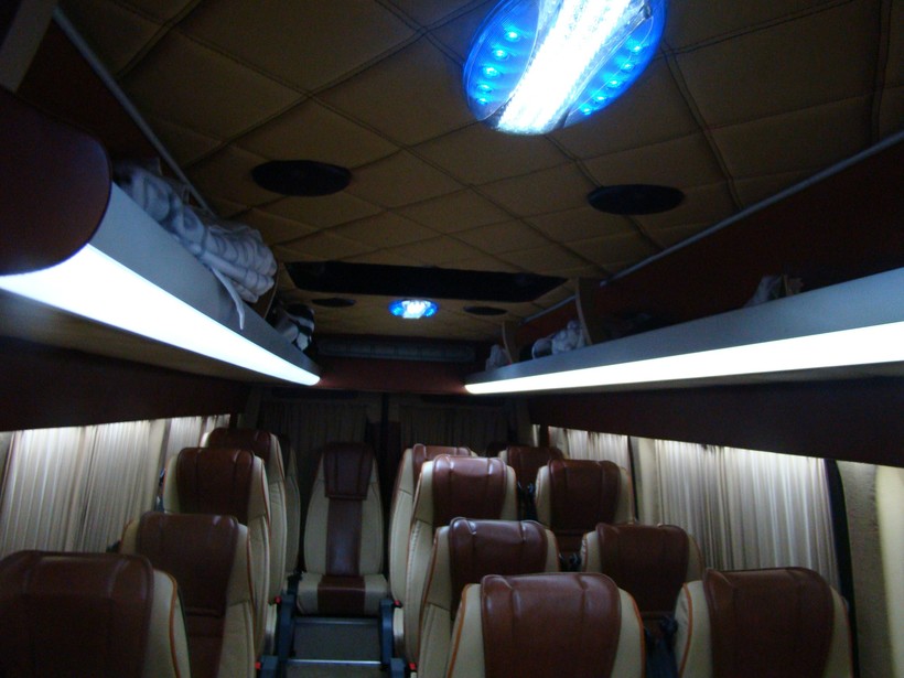 А по факту, для меня, реальная картинки поездки имела негативный окрас. Я ожидала, что по данному маршруту ходит большой комфортабельный автобус, а на самом деле — скромненький микроавтобус, вроде Volkswagen. Однако, салон ухоженный, чистый, сидения мягкие, тут же был телевизор и хорошая подсветка.