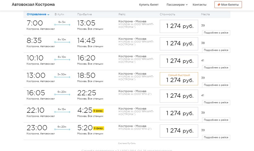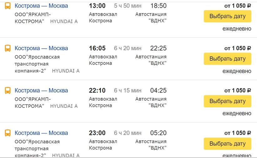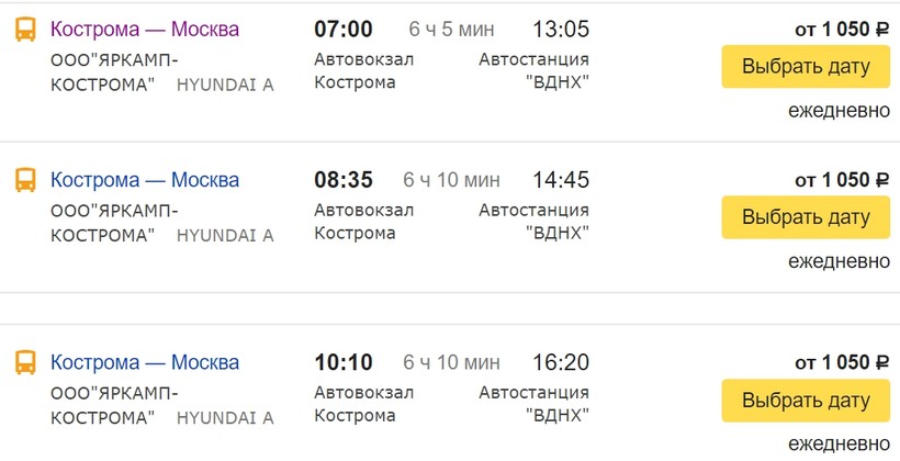 На автовокзале много зазывал, которые обещают домчать до Москвы с ветерком буквально за пару часов. Взглянув на их убитые маршрутки, однозначно решила ехать на рейсовом автобусе. Благо автопарк в последние годы сменился. И вместо убитых икарусов наконец-то на маршрут вышли приличные HYUNDAI A. Официальных перевозчиков два - ООО «Яркамп-Кострома» (с ним и ехала я) и ООО «ЯТК-2». Расписание удобное.