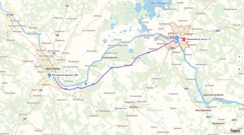 Расстояние от Костромы до Ярославля по автомобильной дороге составляет 83 километра или 52 мили.