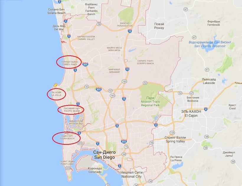 В Сан-Диего есть много прекрасных пляжей, где можно валяться на песке, купаться в Тихом океане, заниматься сёрфингом. На карте я отметила пляжи, которые считаются самыми живописными и интересными.