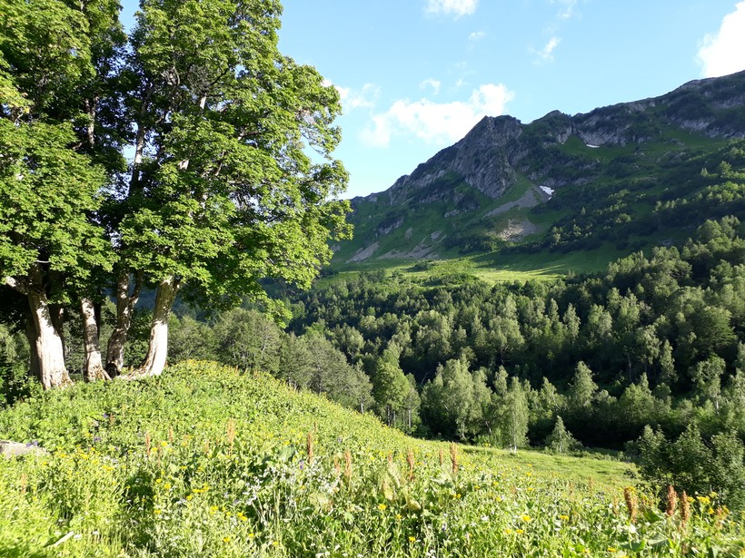 Конечной же точкой маршрута было скрытое высоко в горах озеро Мзы. Вот до него-то от альпийских лугов и был запланирован своеобразный поход. Преодолеть нужно было около пяти-семи километров в одну сторону. Дорога не слишком сложная, крутых подъемов нет, но все же попадаются и трудные участки. Путь пролегает через хвойный лес, альпийские луга, узкие холодные горные речки. Пейзаже по дороге настолько красивы, что усталость даже не чувствуется.