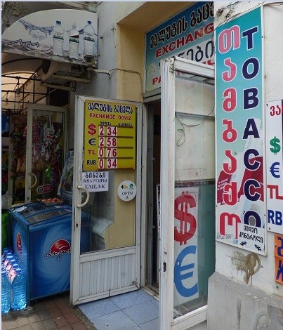 Рубли, доллары и евро официально не принимают для оплаты товаров, но когда у меня уже закончились лари наличкой, а терминала для карты не было, то в некоторых местах на улице и рынке (речь не идёт о магазинах с кассой) можно было договориться оплатить рублями, но конечно по самому выгодному курсу для продавца. На улицах цены пишутся как в лари, так и в тетри, и обозначения, между прочим, указываются на грузинском языке (т.е. начальные буквы л или т). Поэтому чтобы не запутаться запомните: л красивая волна (ლ), а т – кружочек с крючком (თ):)