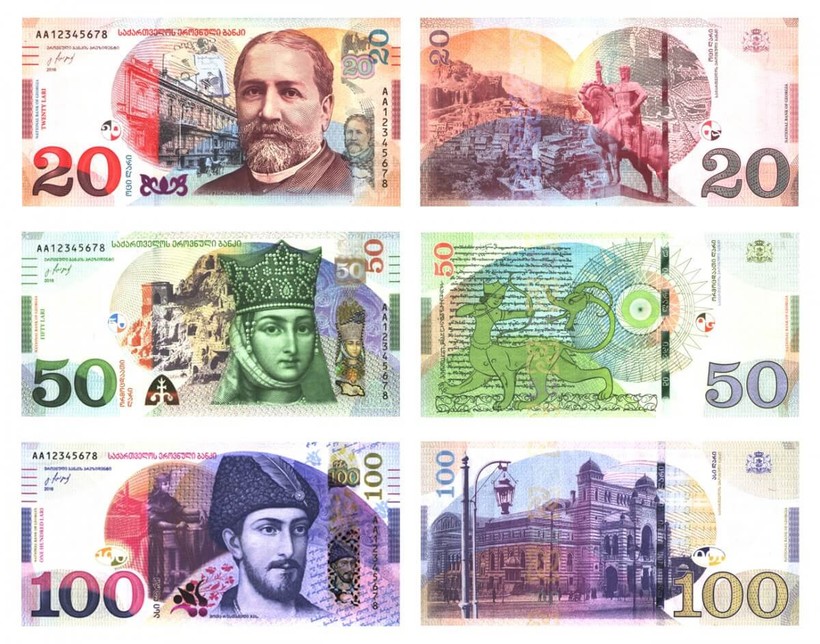 В Грузии официальная валюта лари и тетри (gel). Лари - это аналог нашего рубля, а тетри это копеечки) Лари выпускаются следующим номиналом: 1, 2, 5, 10, 20, 50, 100 и 200. Причём 1 и 2 лари есть как монетками, так и бумажками. Банкноты красивые, особенно нового образца, на них изображены выдающиеся личности Грузии: царица Тамара, Шота Руставели, Илья Чавчавадзэ, Иванэ Джавахишвили, а на оборотной стороне знаменитые символы или фрагменты грузинской истории. У всех тетри одинаковая сторона «орла» - изображение символа солнца.