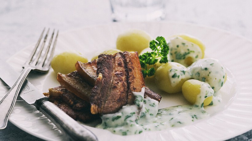 Это блюдо я заказала только потому, что официант сообщил, что оно было признано самым популярным блюдом Дании. Очень простое и настолько же вкусное. Это божественная грудинка, зажаренная до невероятной на вид и вкус золотистой хрустящей корочки. К мясу предлагается отварной картофель и щедрая порция сметанного с зеленью петрушки соуса. Умопомрачительное блюдо. Никогда бы не подумала, что элементарная свинина с картошкой может быть настолько вкусна.