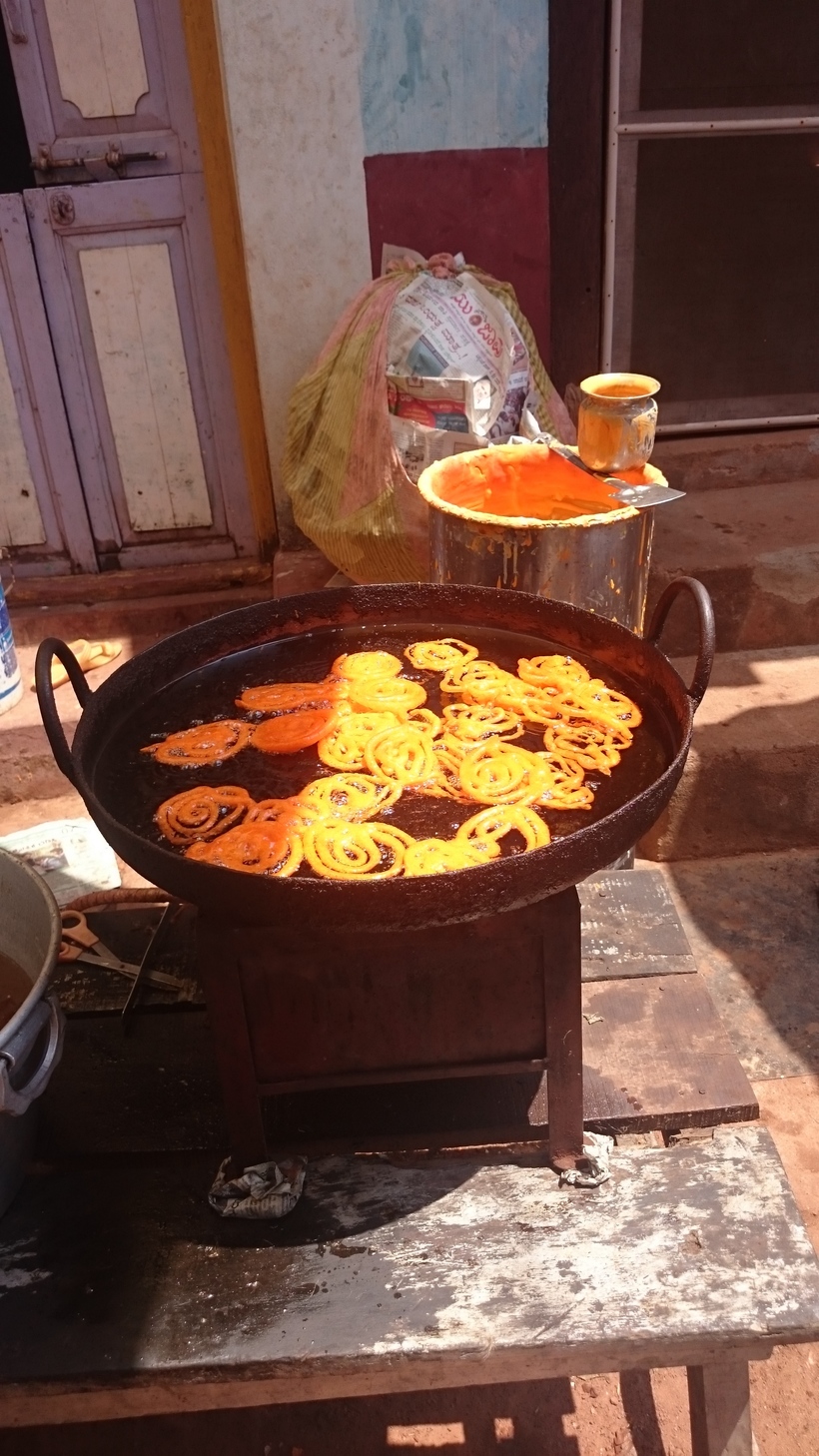 И второе - джалеби - на улочках Гокарны прямо в огромном котле на улице жарят (или варят) сладость-улитку из муки и манки. На вкус волшебно, но сколько там калорий, подумалось сразу.....Хотя толстых индийцев видела немного.